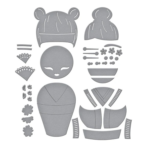 這款精緻的刀模組可組裝出兩種可愛的日本傳統木芥子娃娃(Kokeshi)。一款為單髮髻造型,另一款為雙丸子頭,