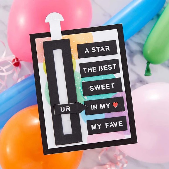 一張生日卡怎麼可以沒有驚喜機關呢?這款刀模組能組裝出一個「滑動式選語」設計,只要拉動箭頭,