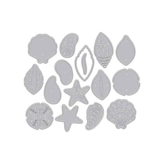 這組金屬刀模精緻雕刻出各種貝殼造型,如海星、扇貝、沙錢與海螺等,每一個設計都充滿細節,能為夏日風格的手作增添豐富層次。