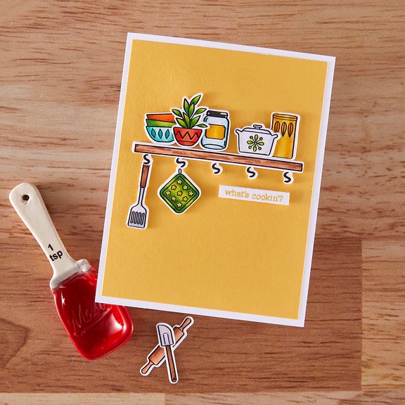 這組 21 款透明印章與對應刀模,可創造出一個掛滿鍋碗瓢盆的廚房層架場景