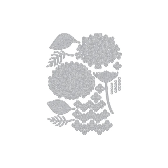 將繡球花的繽紛與層次美感細緻呈現。透過多層次的刀模設計,可堆疊出立體飽滿的花朵與葉片,無論是卡片、標籤或禮物裝飾都能成為優雅亮點。