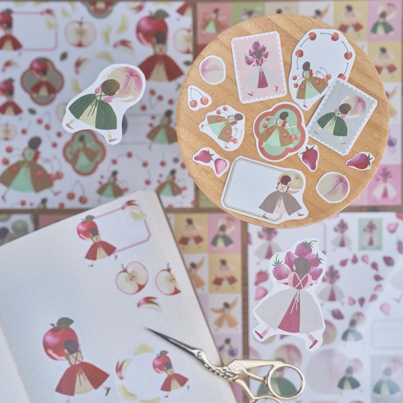 以拿著水果的可愛女孩角色最為知,女孩大多呈現背對姿勢