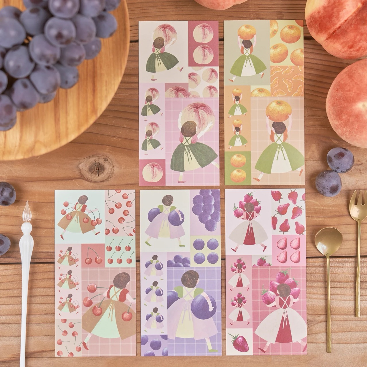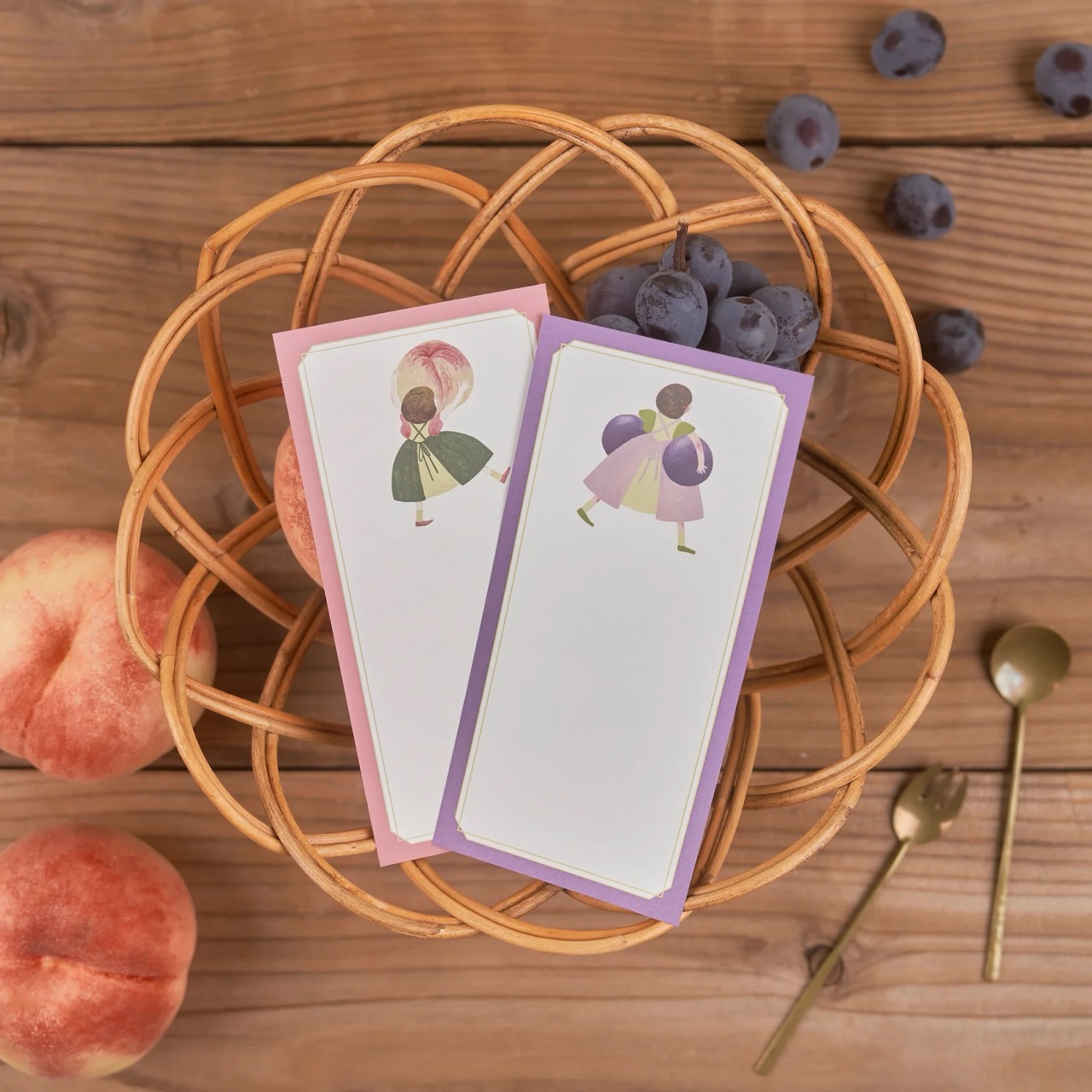 這是一款描繪女孩們捧著水果的插圖一筆箋。
