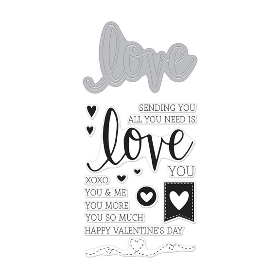 這款 Love 愛的字句印章+刀模組 由 Hero Arts 推出,結合一組風格優雅的透明印章與對應的金屬花體刀模,