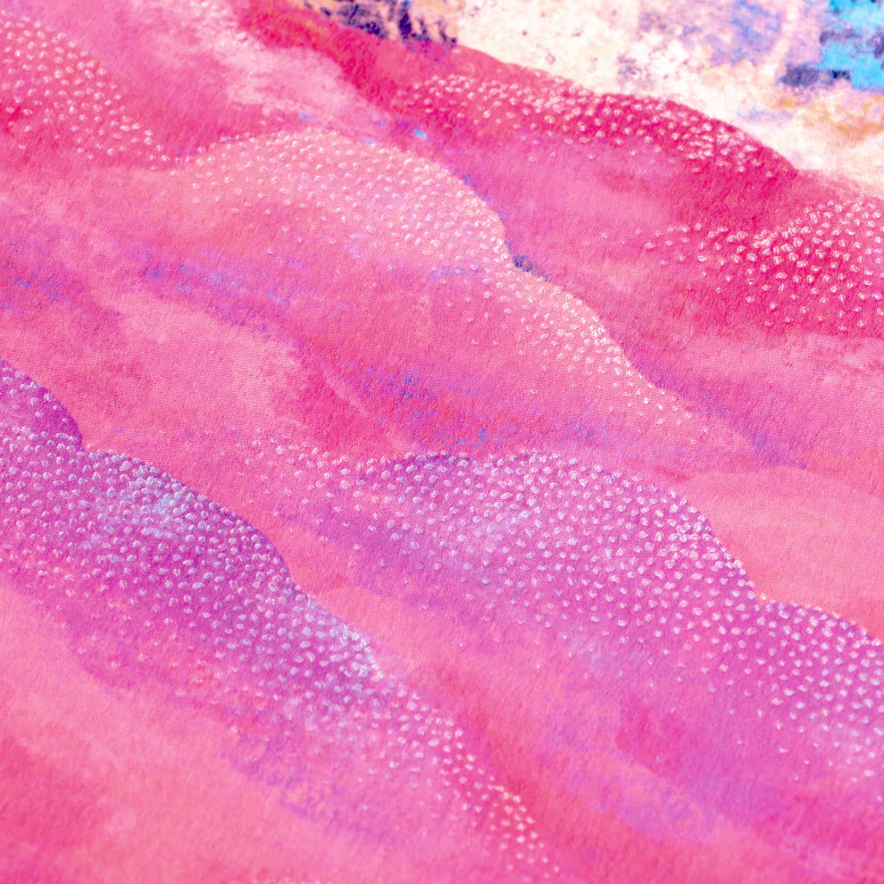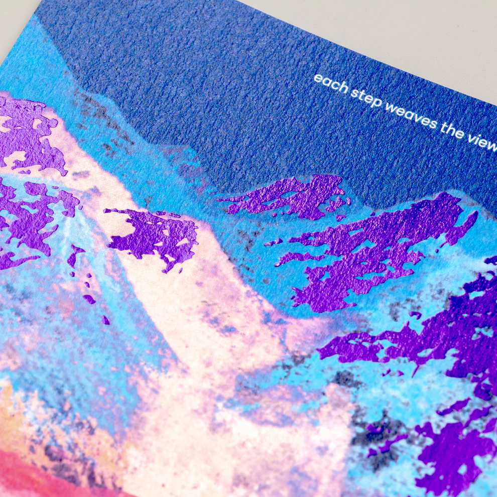 設計上以金屬燙金強調山體的立體起伏,並運用透明箔細膩呈現雲霧流動與空氣層次,使畫面在光線下展現柔和變化與深度,低調中蘊含細緻光澤。