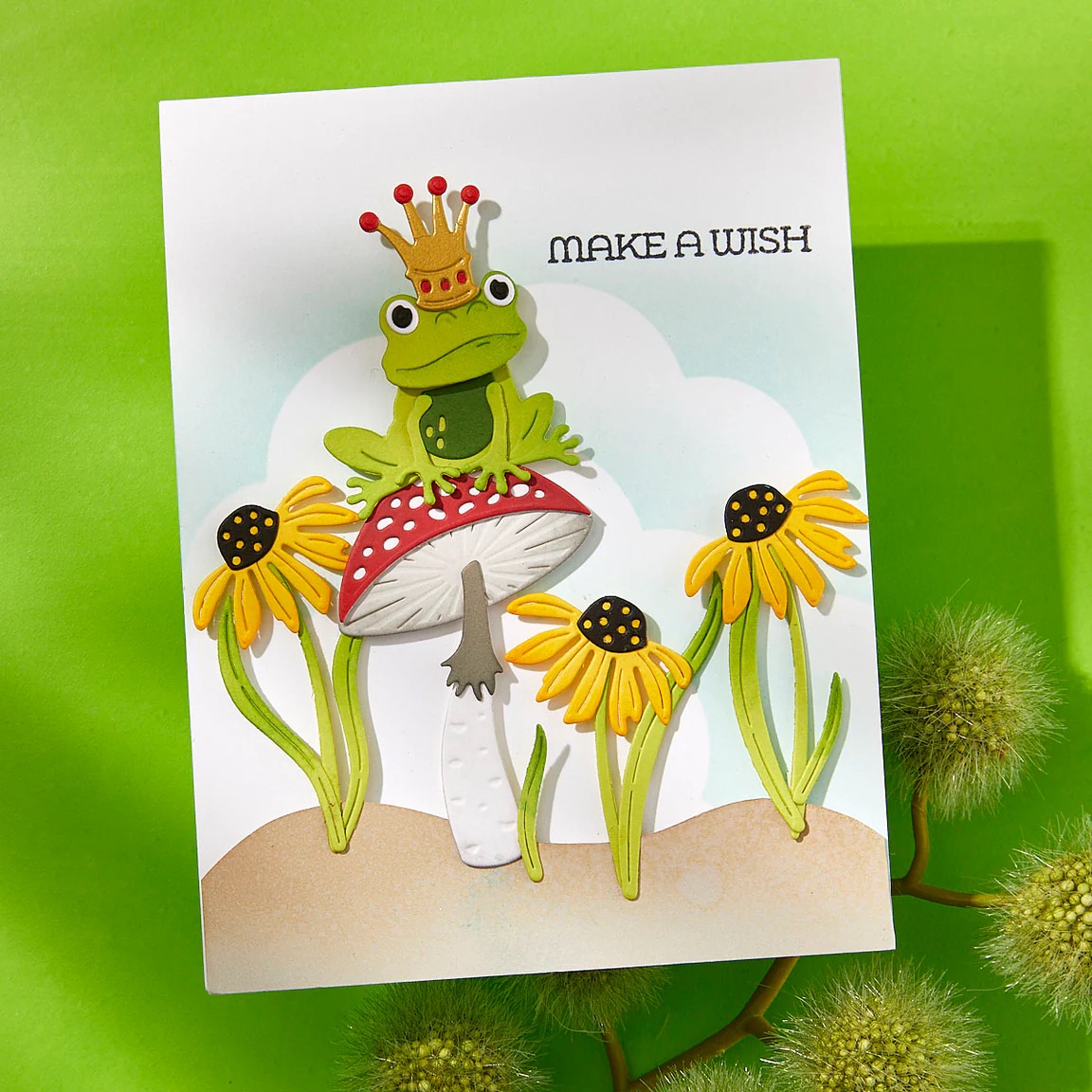 這款《Frog Prince》刀模組內含 18 件金屬刀模,可以組合出 戴著皇冠的青蛙王子,以及搭配的 蘑菇、雲朵、草叢與花田,