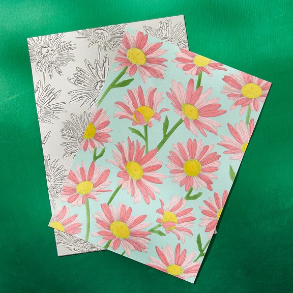 以壓印打造出細膩雛菊線條背景,再疊加型版進行上色
